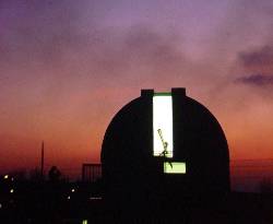 Kuppelspalt ist der historische Messing-Refraktor erkennbar, der bis der Eröffnung der Sternwarte im Jahr 1983 bis 1989