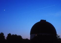 Der Mond über der Kepler-Sternwarte Linz, aufgenommen in der Morgendämmerung am 8. Juni 2004 (vor dem