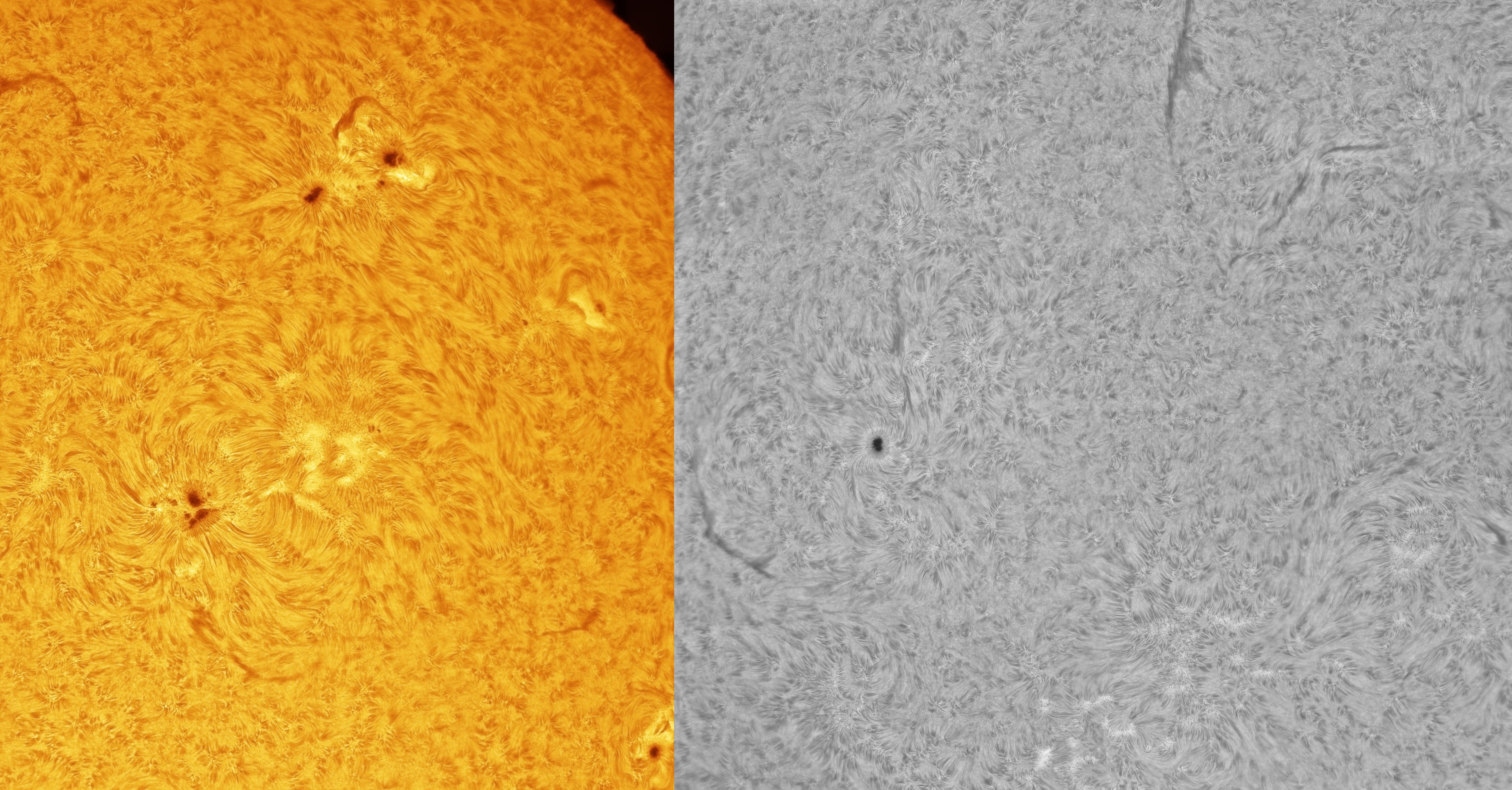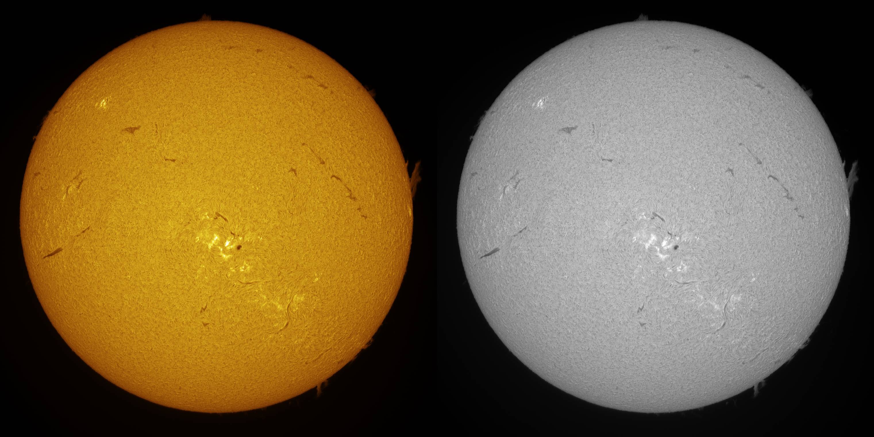 Die Sonne im h-alpha Licht in Farbe und SchwarzWeiß Foto: Dominik Pichler