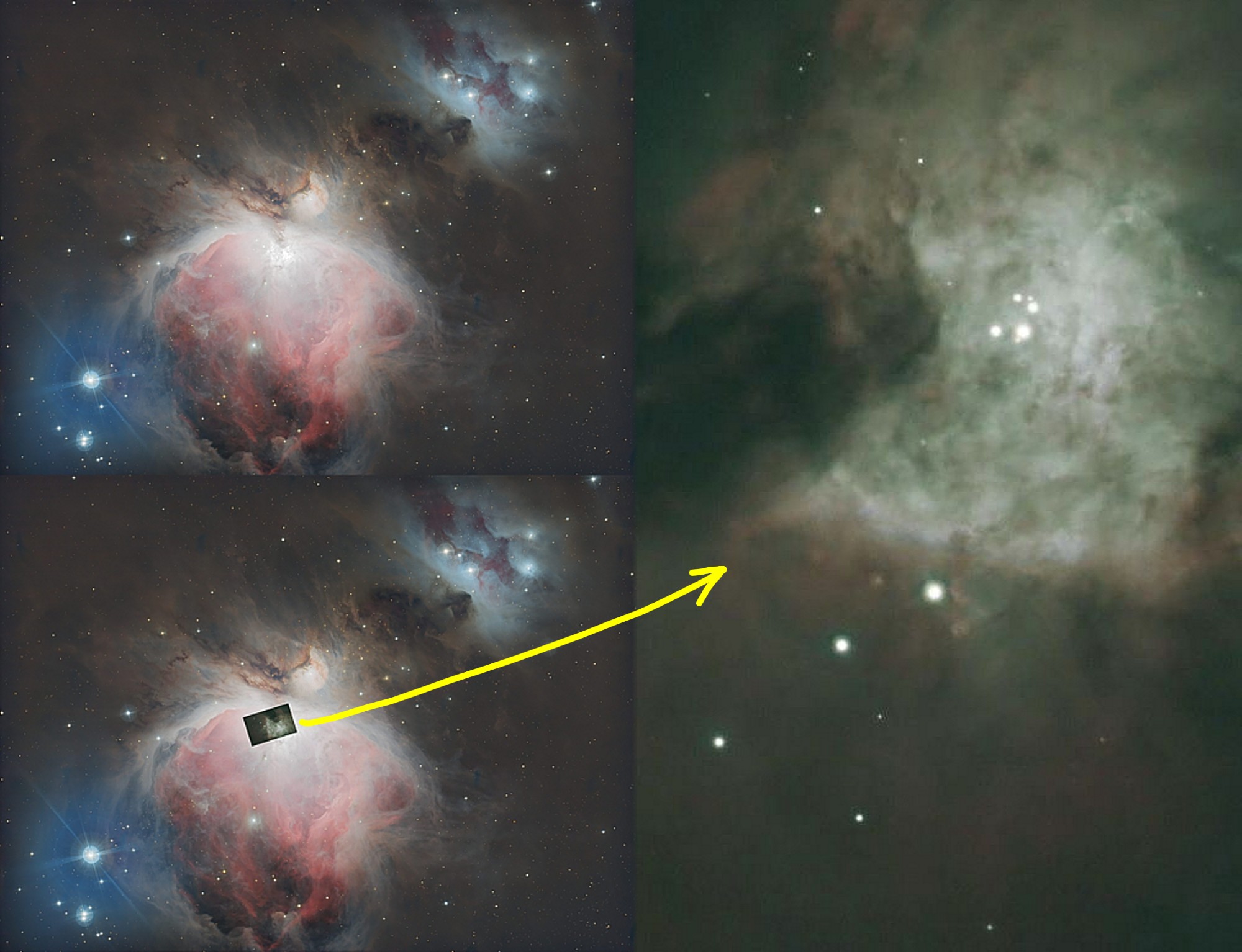 Die Sternentstehungsregion im Orion(M42) mit 681mm Brennweite als Überblicksaufnahme versus 5000mm Brennweite (der kleine Ausschnitt im Bild)