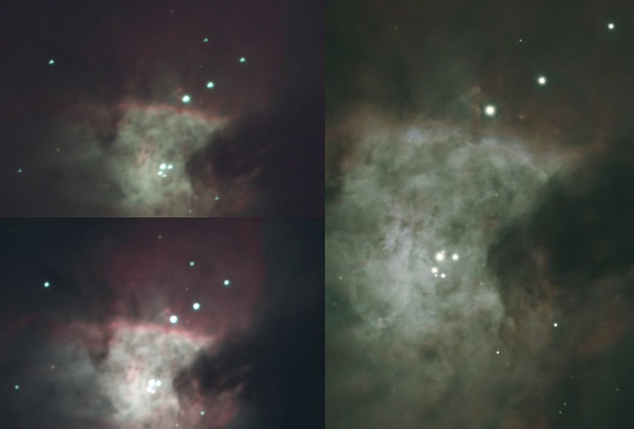 Rechts sieht man die hochaufgelösten Sterne des Trapetz im Orion mit 5000mm Brennweite.