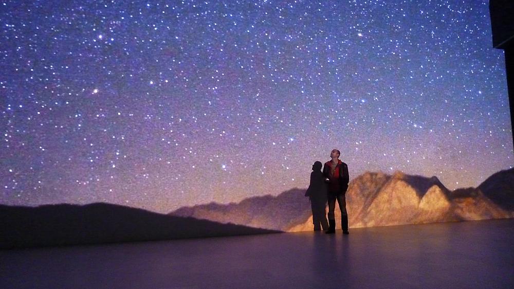 TWAN Fotos werden erstmals mittels 8 synchronisierter Hochleistungs-Full-HD-Projektoren im Format 16 x 9 Meter bzw. unter Einbindng der Bodenprojektoren im Format 16 x 18 Meter präsentiert ! Ebenso werden in dieser Dimension faszinierende Anblicke auf TWAN-Zeitrafferaufnahmen möglich sein. Gekoppelt mit der kraftvollen Musikanlage des AEC wird für die Besucher die Betrachtung des Himmels in Kombination mit den schönsten Plätzen der Erde ein einmaliges Erlebnis sicherstellen. Neben den Darbietungen im DEEP SPACE stehen weitere synchronisierte Full-HD-Beamer im Konferenzsaal für Panoramaprojektionen und das Foyer im Tiefparterre mit HD-Screens zur Verfügung. Erstmals wird das TWAN-Material ausschließlich digital präsentiert.