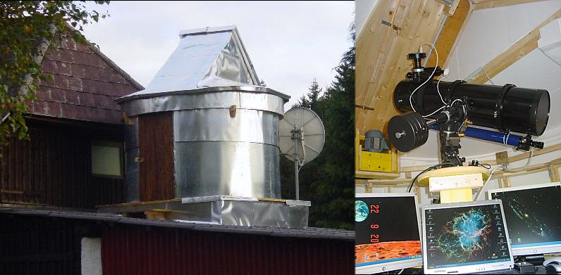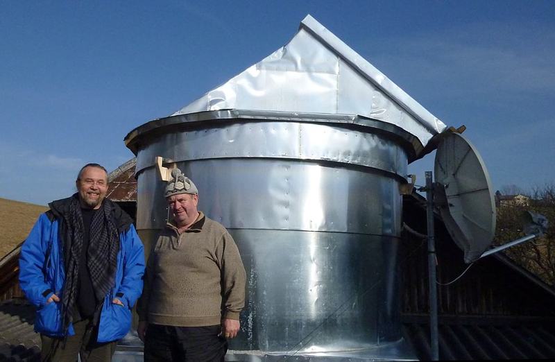 Hier bin ich bei Johann zu Besuch bei seiner Garagensternwarte, die ebenfalls wetterfest mit alten (0,3mm) Druckerblechen eingedeckt ist, die hinkünftig auch meinem Trailer als Verkleidung dienen werden.