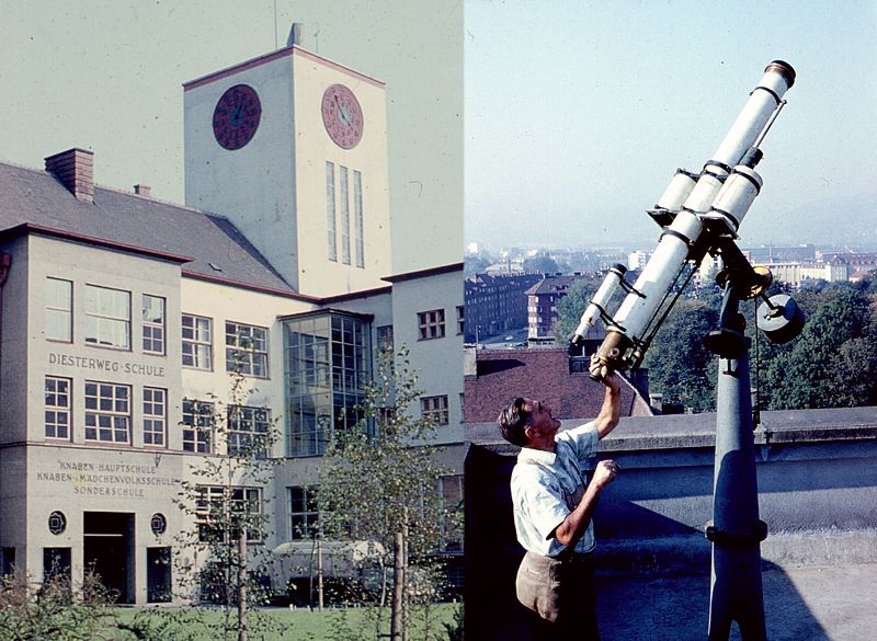 Die nächste Anschaffung war der 5 Zöllige Refraktor, der seinen ersten Platz auf dem Turmdach der Diesterwegschule fand.