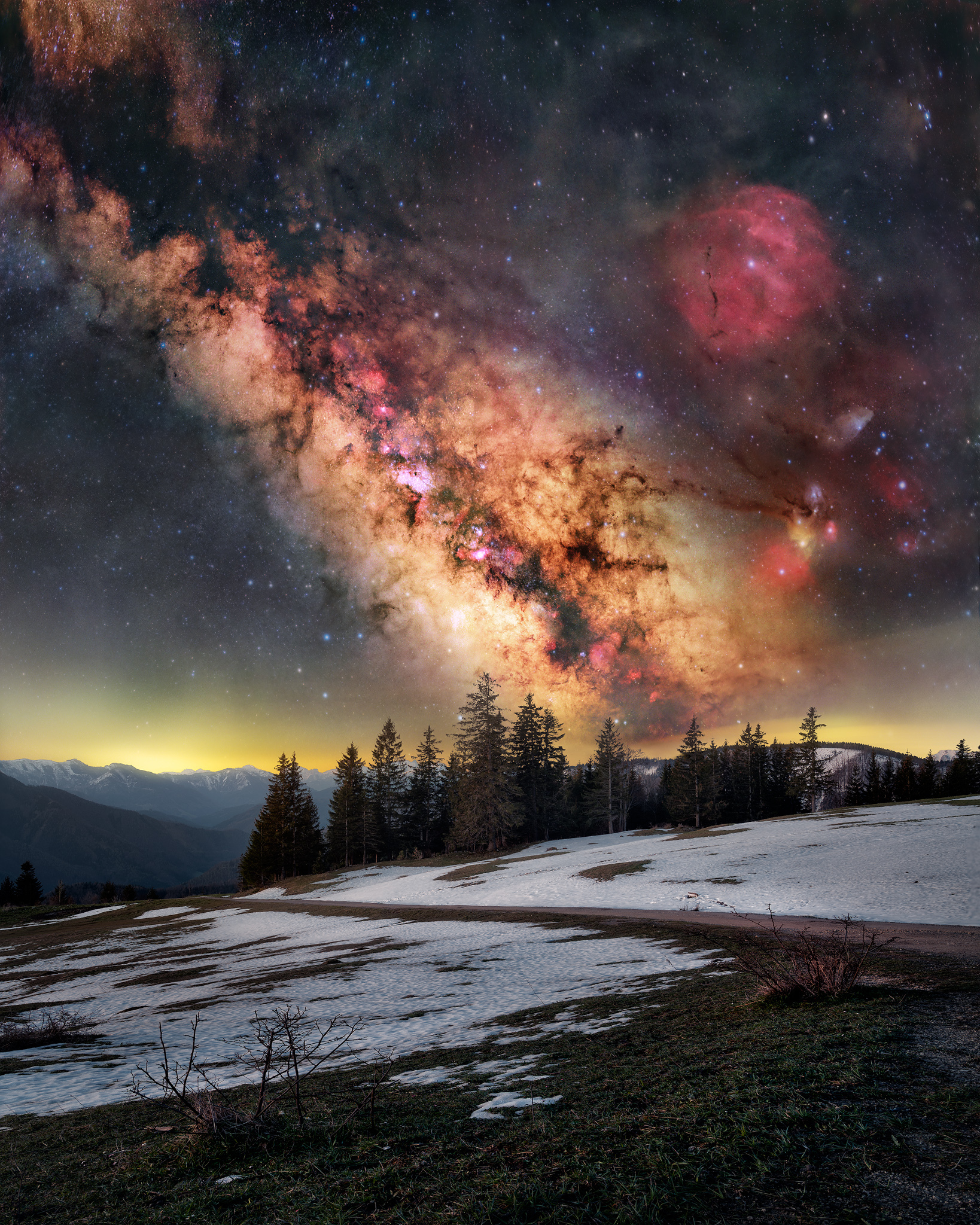 Obige beeindruckende Aufnahme gelang unserem Vereinsmitglied Dominik Hölzl. Er ist ein leidenschaftlicher Natur- und Landschaftsfotograf, insbesondere im Bereich Astro-Landschaften. Er verwendet für seine Bilder diverse Techniken wie Time-Blending, Fokus-Stacking des Vordergrunds, Parallele Belichtung mit unmodifizierter DSLR-Kamera und astromodifizierter DSLR-Kamera mit Schmalbandfiltern und Weichzeichner-Filter, Mosaik/Panorama-Technik für bessere Bildqualität.Seine Spezialität ist es die Landschaft in ein Gewebe aus Sterne & Gasnebeln zu verorten. Seine Aufnahmen sind quasi weiterentwickelte TWAN-Aufnahmen. Solche Aufnahmen entsprechen natürlich nicht mehr dem realistischen Anblick bei Nacht mit freiem Auge, aber sie zeigen die Lage und Position der realen Landschaft im Kontext zum realen Sternenhimmel, wie er sich zum Zeitpunkt der Aufnahme präsentiert und wie er eben mit der heutigen Technik aufgenommen werden kann - also den Himmel den wir über uns sehen würden, wenn wir "Superaugen" hätten und es keine Lichtverschmutzung geben würde. Mit dieser Technik entstand folgende beeindruckender Anblick der Sommermilchstraße im Areal der Sternwarte auf der Hohen Dirn.