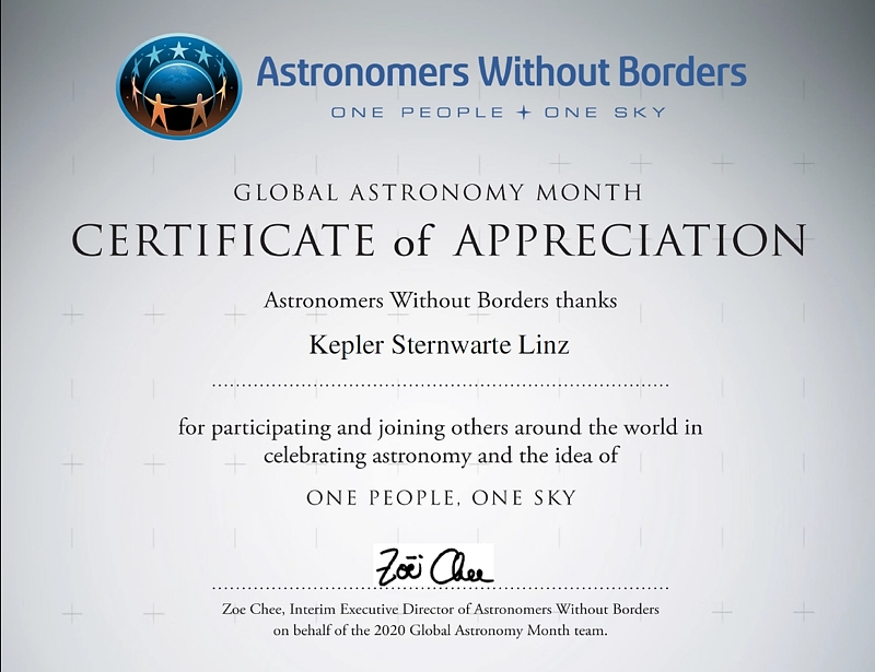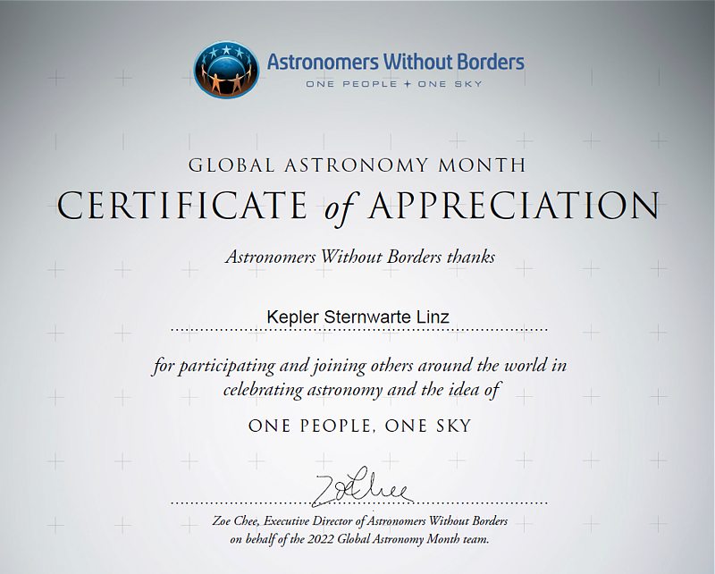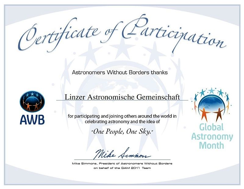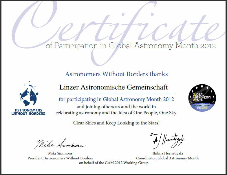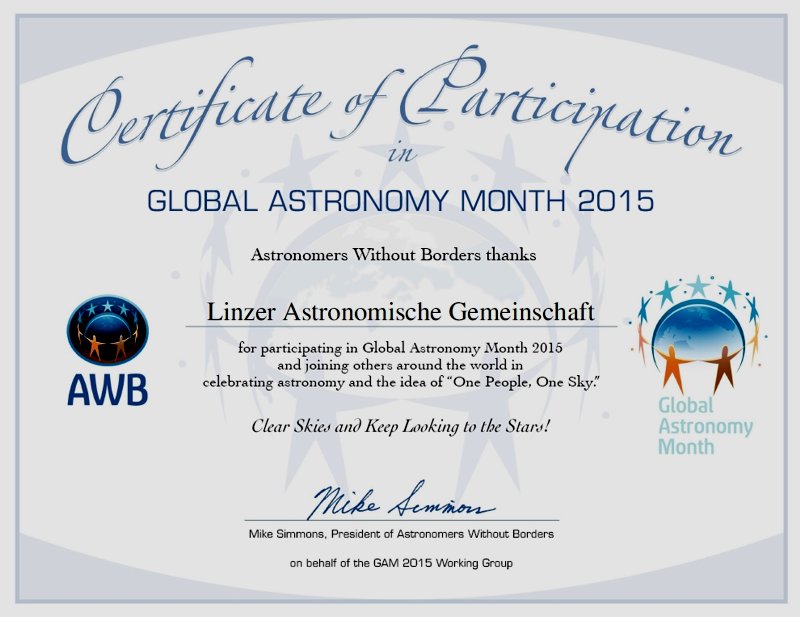 Seit dem ersten globalen Astronomiemonat (2010) bis heute hat die Linzer Astronomische Gemeinschaft die Internationale Idee des Globalen Astronomiemonats immer unterstützt. Diese aktive Teilnahme wurde seitens der Organisation mit einem Teilnahme-Zertifikat bestätigt und honoriert. Nachfolgend ein Überblick über alle Zertifikate.