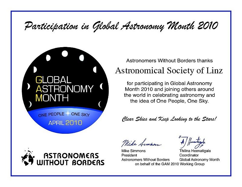 Dieses offizielle Zertifikat bestätigt die Teilnahme der Linzer Astronomischen Gemeinschaft am ersten weltweiten Astronomiemonat (April 2010) und ist zugleich ein Dankeschön seitens der Organisation Astronomers Without Borders für die Beteiligung der LAG an dieser weltweiten Idee.