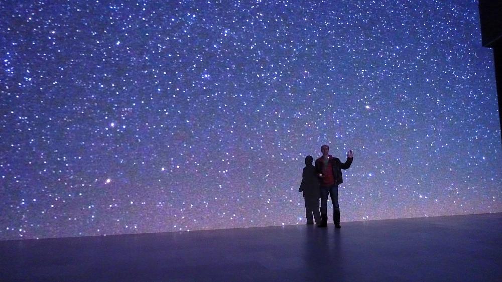 TWAN Fotos werden erstmals mittels 8 synchronisierter Hochleistungs-Full-HD-Projektoren im Format 16 x 9 Meter bzw. unter Einbindng der Bodenprojektoren im Format 16 x 18 Meter präsentiert ! Ebenso werden in dieser Dimension faszinierende Anblicke auf TWAN-Zeitrafferaufnahmen möglich sein. Gekoppelt mit der kraftvollen Musikanlage des AEC wird für die Besucher die Betrachtung des Himmels in Kombination mit den schönsten Plätzen der Erde ein einmaliges Erlebnis sicherstellen. Neben den Darbietungen im DEEP SPACE stehen weitere synchronisierte Full-HD-Beamer im Konferenzsaal für Panoramaprojektionen und das Foyer im Tiefparterre mit HD-Screens zur Verfügung. Erstmals wird das TWAN-Material ausschließlich digital präsentiert.