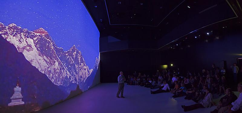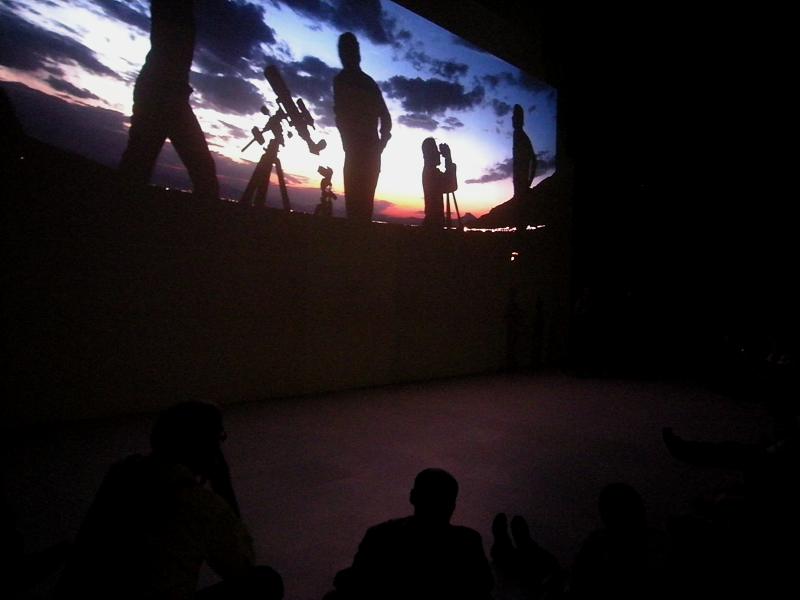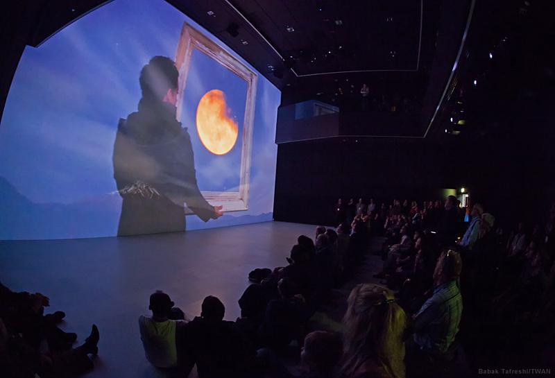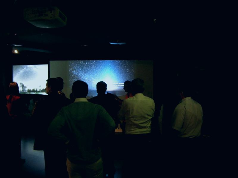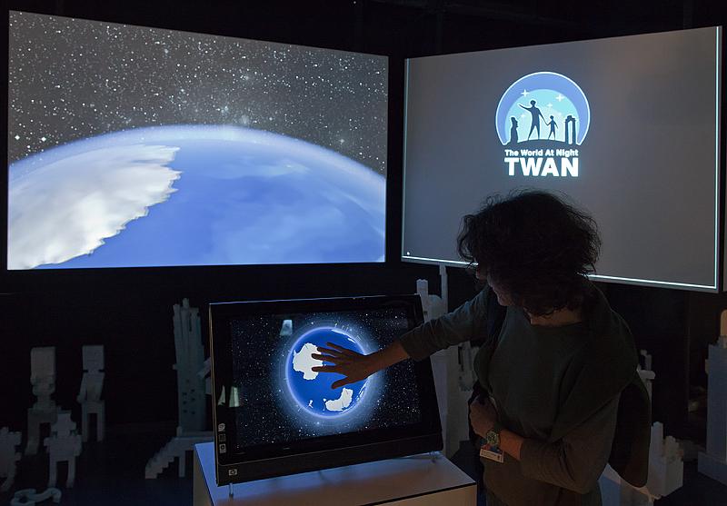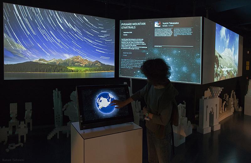 Here you can see one of the highlights of this digital exhibition: The interactive "Globe-Application" where the visitor can play with an virtual globe. He can select a country and display a TWAN-picture from this region. On a second wall additional informations concerning his selection are displayed. In these pictures Pascale Demy is playing with the globe