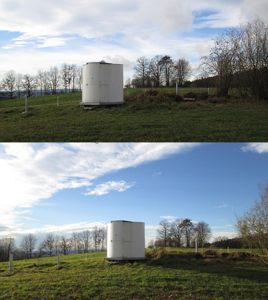 Eine vor kurzem errichtete 3. Außensäule im Norden des Schutzbaus erweitert die Montagemöglichkeiten von Teleskopmontierungen.