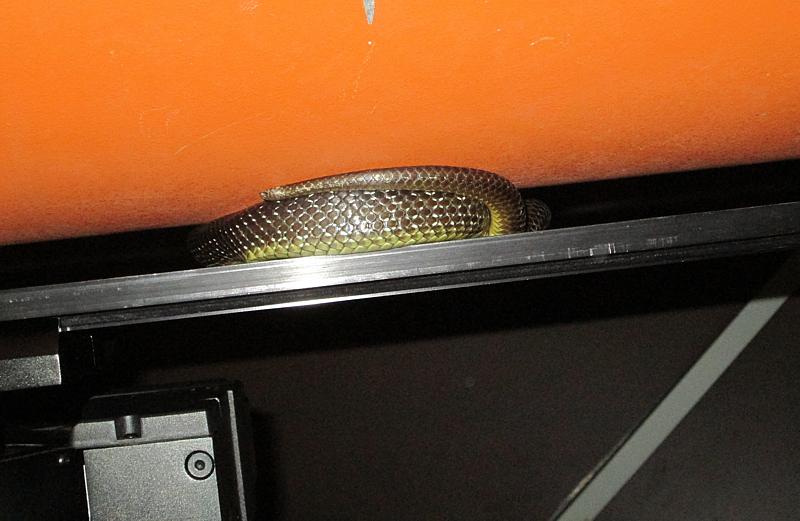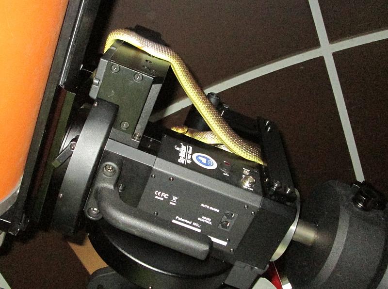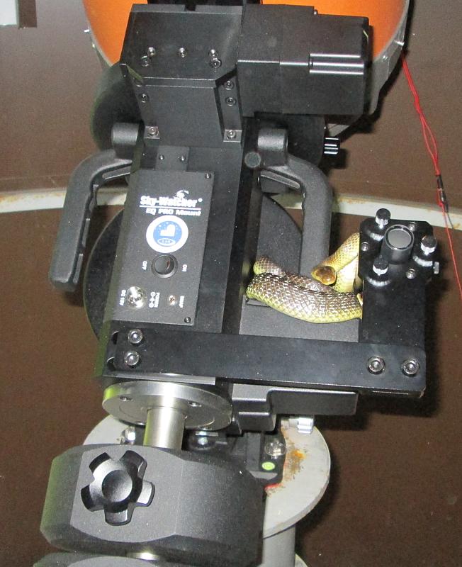 Da hatte es sich doch tatsächlich eine Äskulapnatter im Zwischenraum von Montierung und Teleskop bequem gemacht !