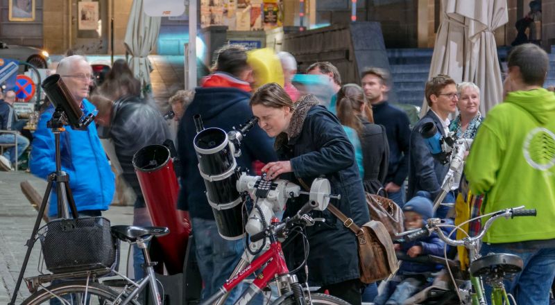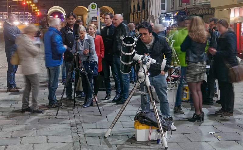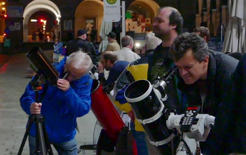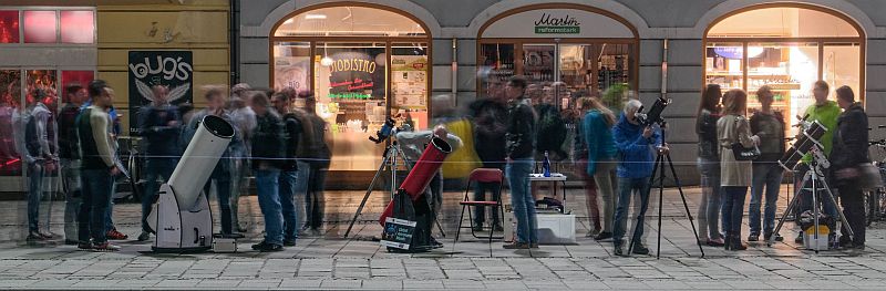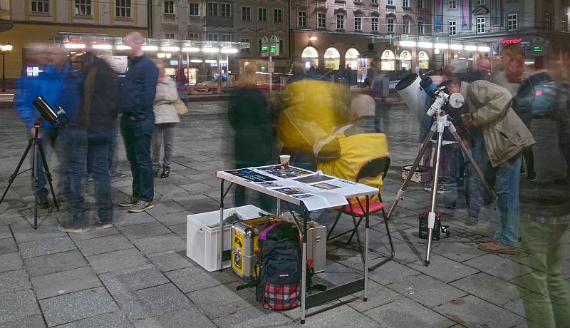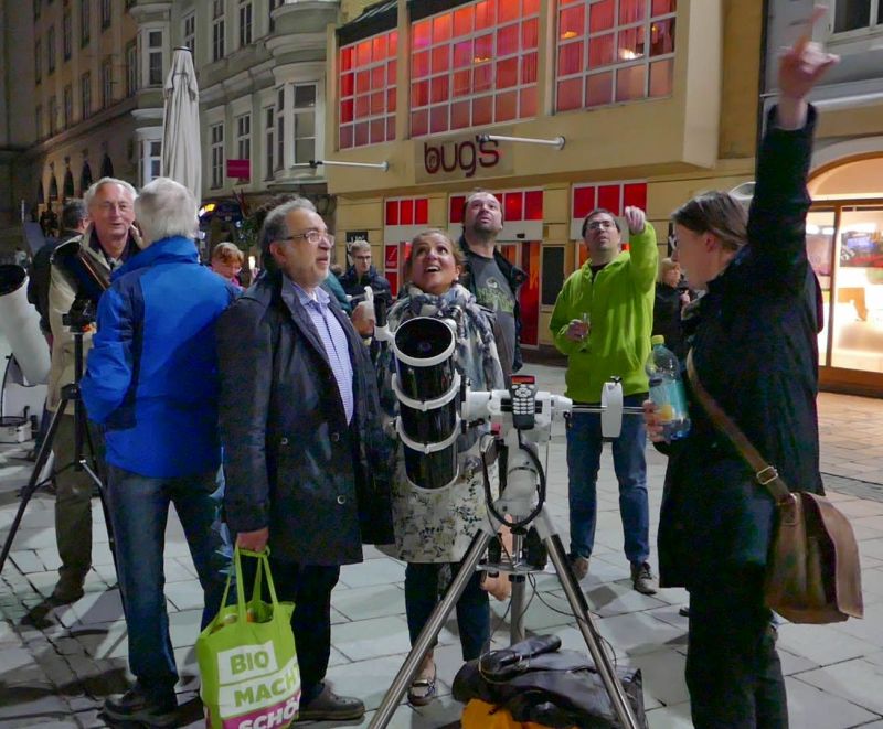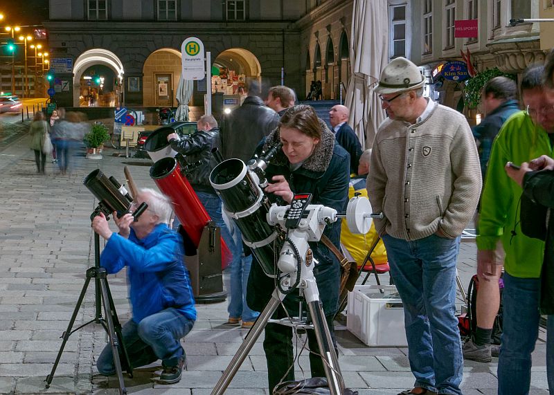 Das motivierte uns natürlich gewaltig und so stellten wir uns mit 5 transportablen Teleskopen am Hauptplatz bereits um 19 Uhr ein. Wir konnten unter guten Bedingungen den mit Kratern übersäten Mond kurz nach dem ersten Viertel und den Planeten Jupiter mit seinen Monden präsentieren. Der Andrang und das Interesse seitens der Passanten war groß, und wir konnten wirksam die Idee des globalen Astronomiemonats vorstellen und unseren Verein und die Kepler-Sternwarte Linz bewerben. Für die meisten der Besucher war dies ihr erster Blick durch astronomische Teleskope und entsprechend wurden wir mit Fragen überhäuft, die von den anwesenden LAG-Vereinmitgliedern freundlich, geduldig und fachlich kompetent beantwortet wurden. Die nachfolgenden Bilder beschreiben die Stimmung am Hauptplatz besser als tausend Worte.