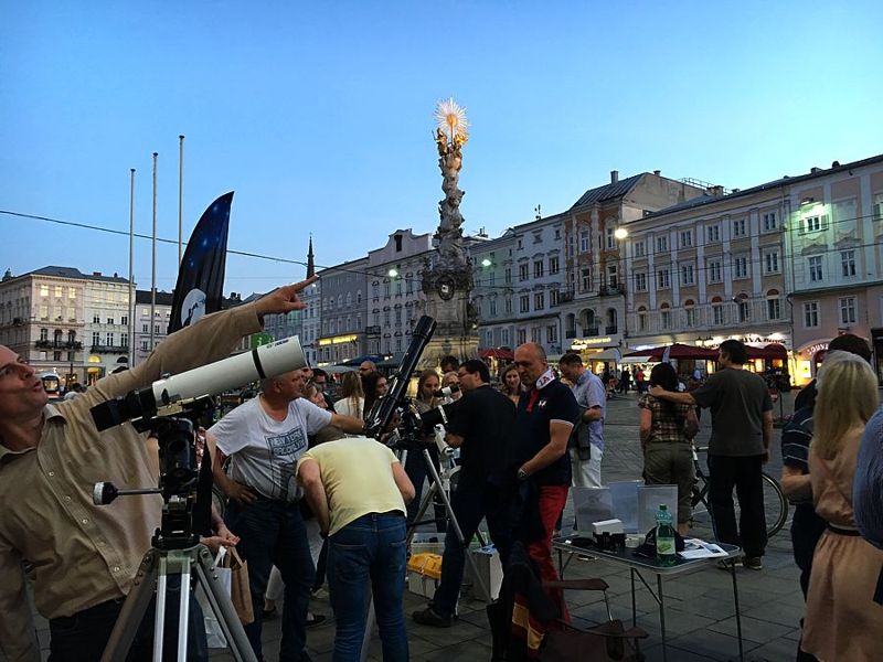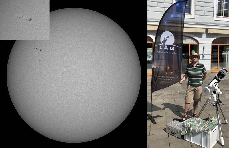 Am Sonntag dem 22.April wurde am Linzer Hauptplatz der internationale "Sunday" ,mit der Möglichkeit zur teleskopischen Sonnenbeobachtung, mitgefeiert. Die Sonne tat uns an diesem Tag den Gefallen ein paar kleine Sonnenflecken im Weißlicht zu zeigen.