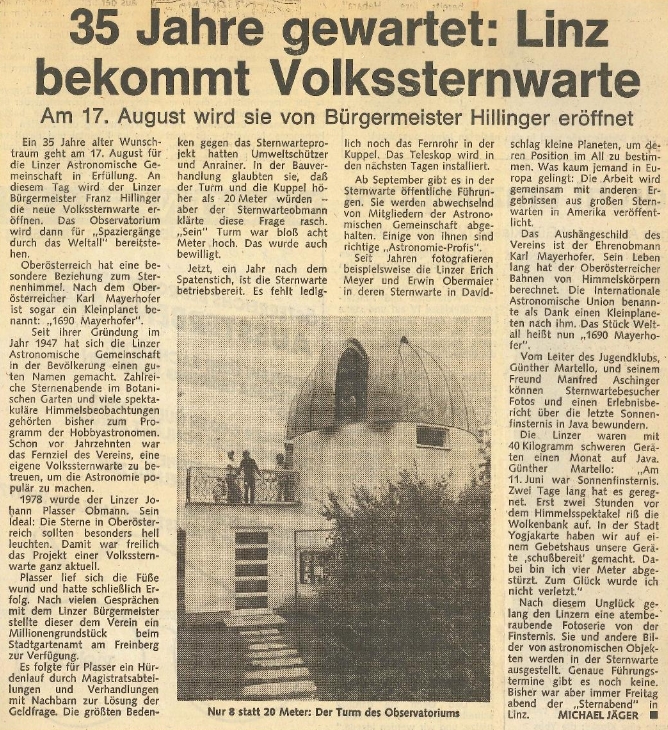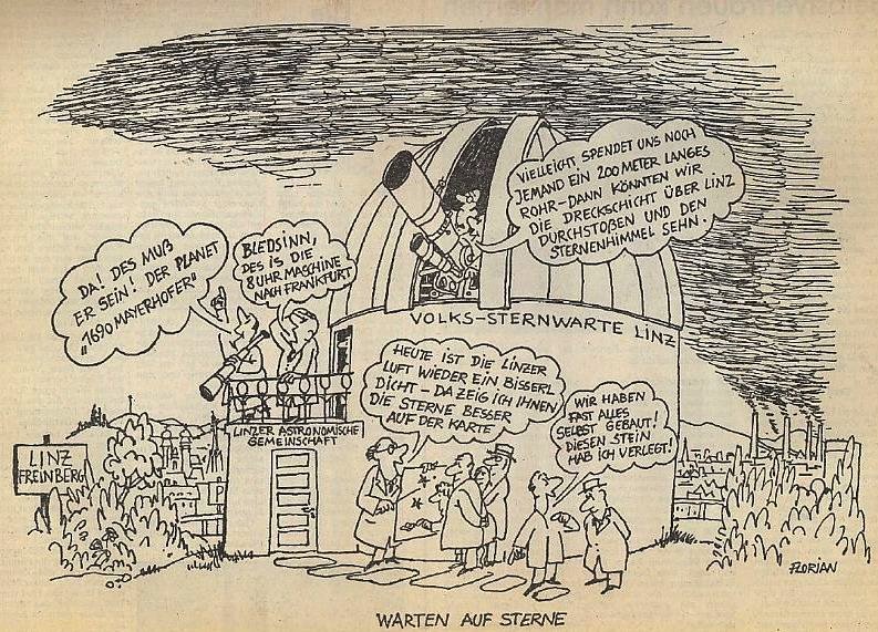 Die Probleme der Sternenbeobachtung aus der Stadt hat damals der Karrikaturist Florian von den OÖN bei der Sternwarteeröffnung im Jahr 1983 bereits auf's Korn genommen, leider sind sie nicht weniger geworden!
